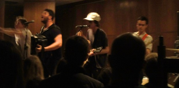 What neither of us anticipated as we headed out the door was just how completely blown away we’d be. The moment The Felice Brothers walked on stage, opening with “Fire at the Pageant,” they had my full and undivided attention. As cliché as it may sound, the stage came alive with intense, menacing, fabulous energy. Here we were in the sparse, crudely lit basement of a church, elbow to elbow with about 200 (?) fortunate others witnessing (no pun intended) the explosive energy spewing forth.