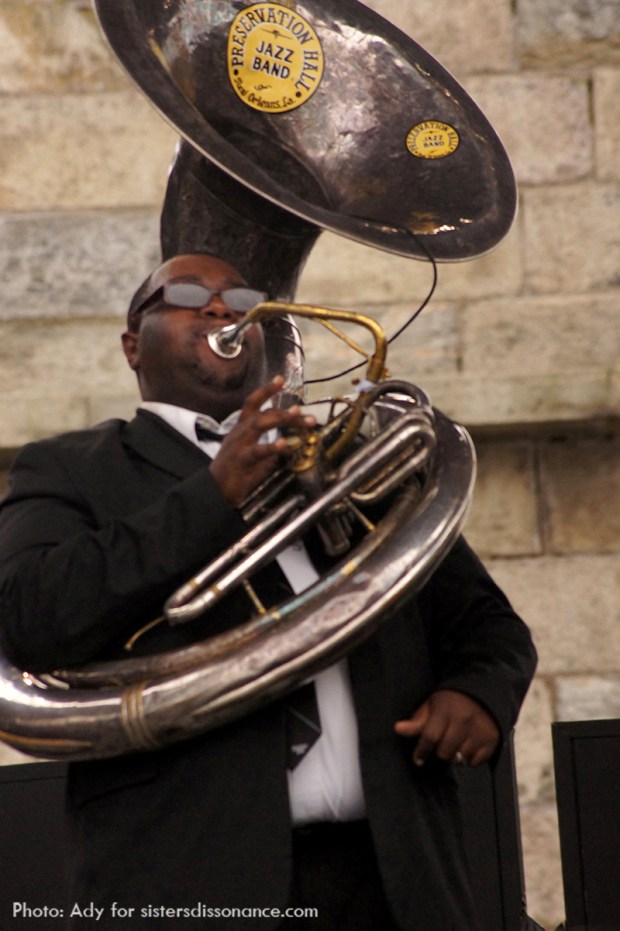 From there we caught (order of appearance may be slightly askew) The Apache Relay for their super-charged set, Alabama Shakes via the screen in the media tent (amazing voice!), and looped around the other two stages, the Quad and Harbor Stages to see Jonny Corndawg, who we both thoroughly enjoyed, and Deer Tick who bowled me over. Preservation Hall Jazz Band (who were joined onstage with Pete Seeger’s grandson, Tao Rodríguez-Seeger and Ben Sollee), I immediately fell crazy in love with. I also did some serious people watching during their set because I really enjoyed seeing how physically affected by the music everyone was—dancing like mad and smiling during the oldtimey upbeat tunes one minute, then moved enough to exchange kisses and embraces during the slower ones the next.